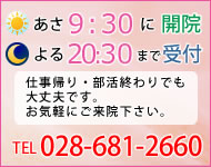 こばやし整骨院〒329-1324 栃木県さくら市草川69-2 TEL:028-681-2660 FAX:028-681-2660 往診も可能、お気軽にご相談下さい。
